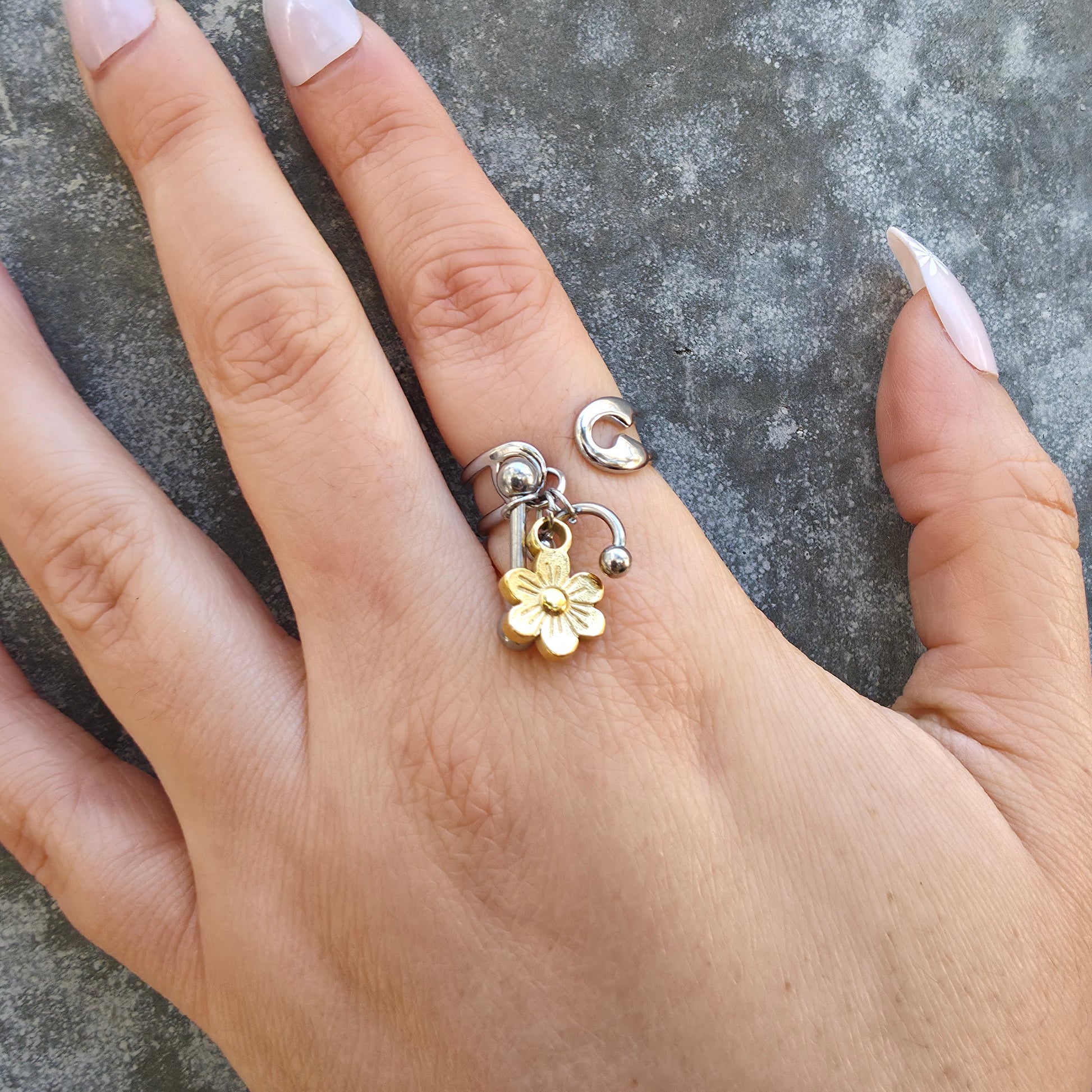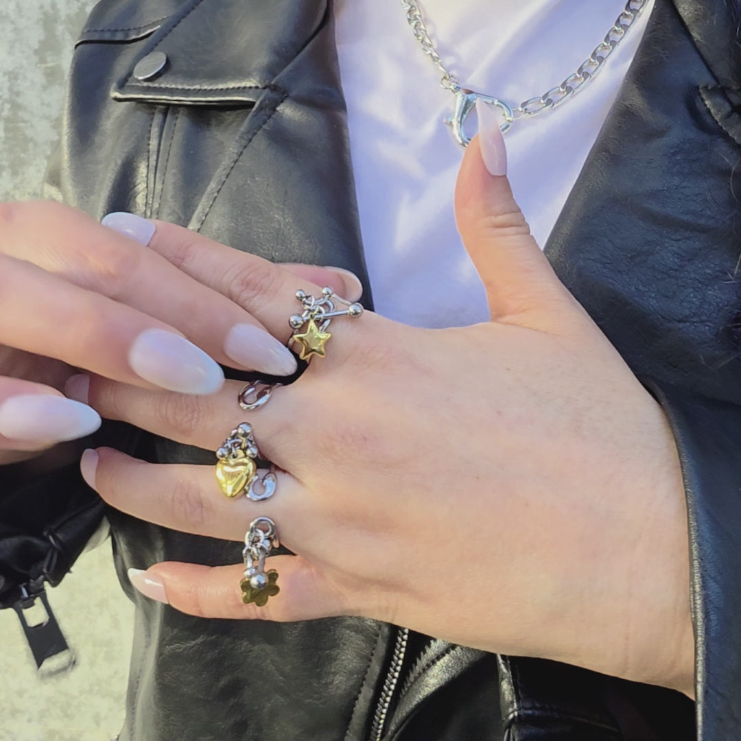 Elevate your everyday look with this audacious adjustable stainless steel ring that refuses to blend in—featuring three striking charms suspended on a sleek band. Available in three distinctive variations, each showcasing lustrous gold-plated accents against polished steel, it's the perfect statement for those who dare to stand out. Wear it as your signature piece—unapologetic, modern, and undeniably striking.