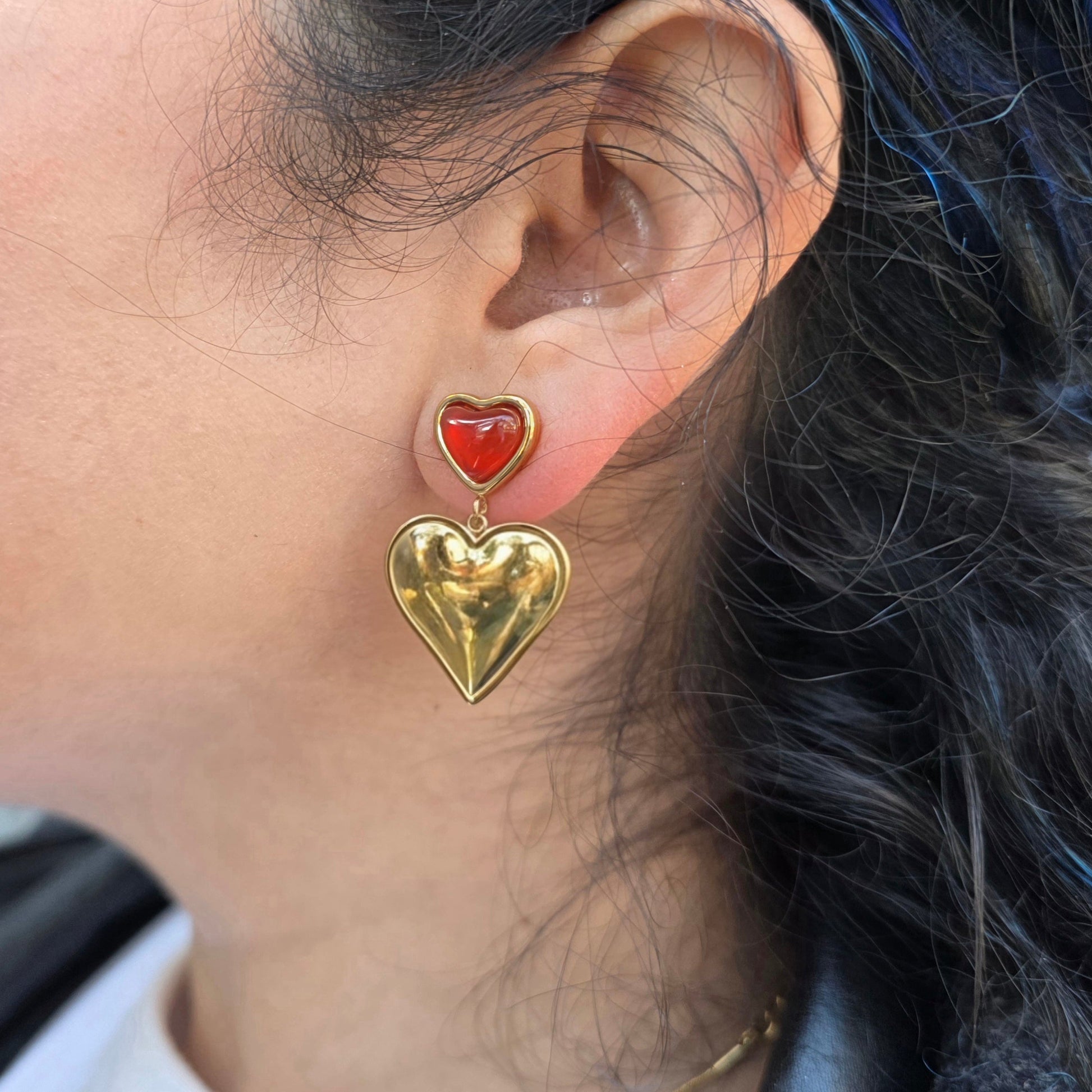 Crafted from gold-plated stainless steel, these heart-shaped studs feature genuine agate quartz in a distinctive double-heart design. The natural stone is traditionally associated with grounding energy, emotional clarity, and protective qualities.